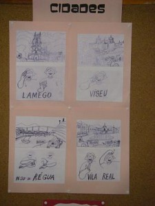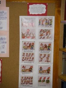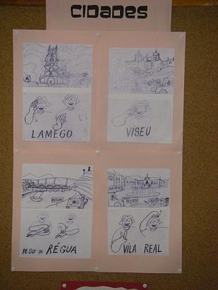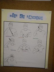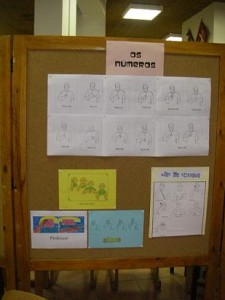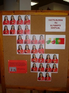 Vimos cartazes com os gestos do alfabeto, números, dias da semana, o nome de algumas cidades e a história da Capuchinho Vermelho adaptada com os respectivos gestos e traduzida para a Língua Portuguesa e para a Língua Gestual.