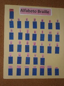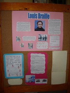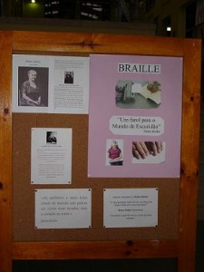 Os cartazes falavam de Louis Braille, o autor do sistema de leitura e escrita para cegos, e de Helen Keller. Havia também um quadro com o alfabeto Braille.
