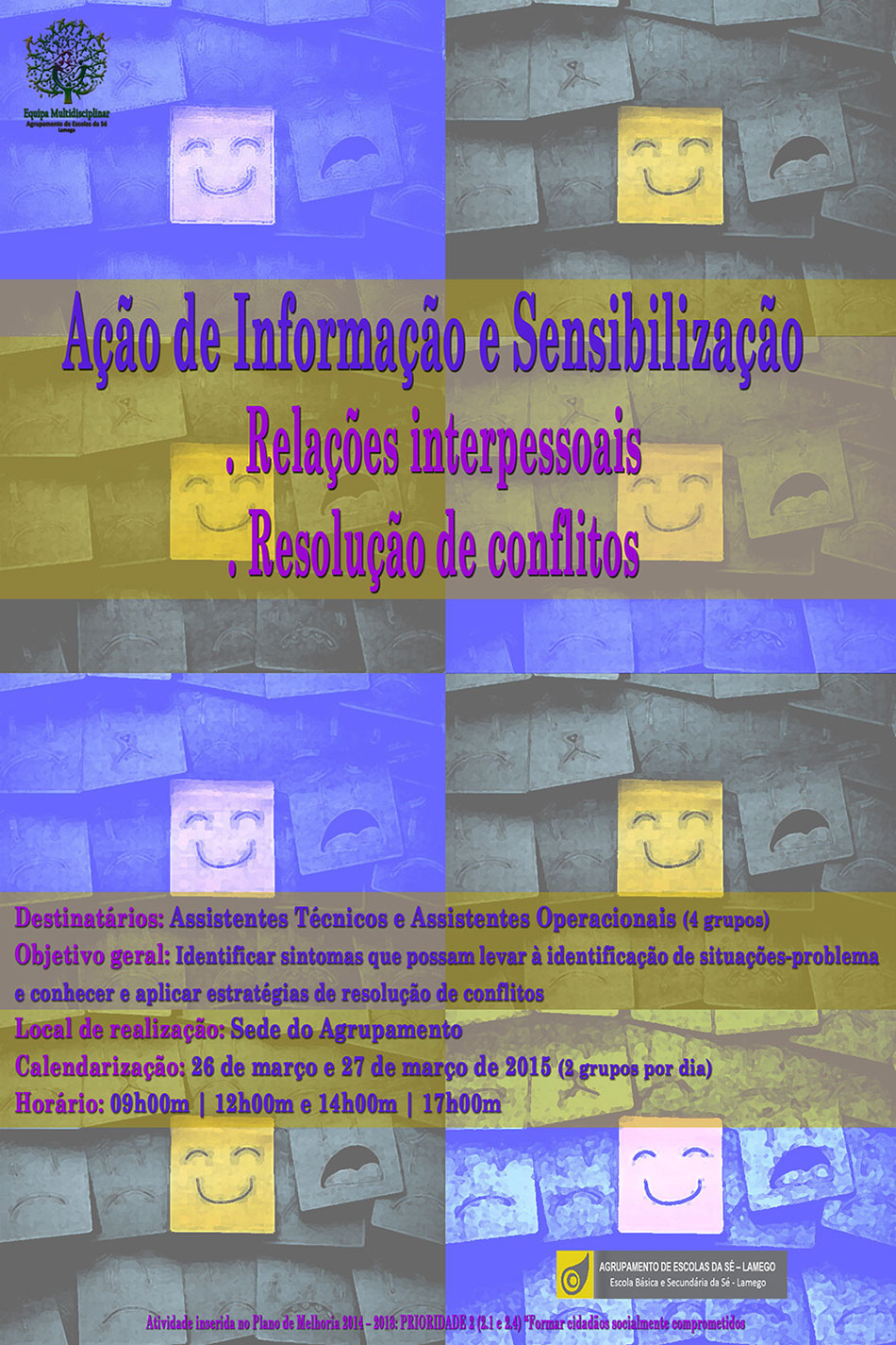 Com o objectivo de permitir uma reflexão sobre conflitos e aprofundar conhecimentos que possibilitem a gestão e resolução dos conflitos de forma assertiva, realizou-se, para os Assistentes Técnicos e Assistentes Operacionais do Agrupamento de Escolas da Sé de Lamego, a ação de informação e sensibilização sobre "Relações Interpessoais e Resolução de Conflitos", que decorreu nos dias 26 e 27 de março. Participaram 50 colaboradores do agrupamento que procederam à avaliação da ação cujos resultados recolhidos foram muito positivos. A referida ação possibilitou a expressão da necessidade de aprofundamento de outras temáticas pertinentes para o desempenho das boas funções da equipa não docente do agrupamento a serem realizadas no futuro.