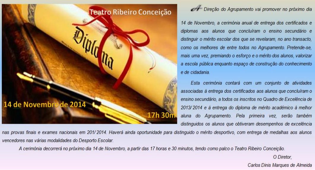 No dia 14 de novembro realizou-se Ribeiro Conceição, a cerimónia anual de entrega dos certificados e diplomas aos alunos que concluíram o ensino secundário e distingui-se o mérito escolar dos melhores alunos, no ano letivo anterior, bem como o mérito desportivo, com entrega de medalhas aos alunos vencedores nas diferentes modalidades do Desporto Escolar.