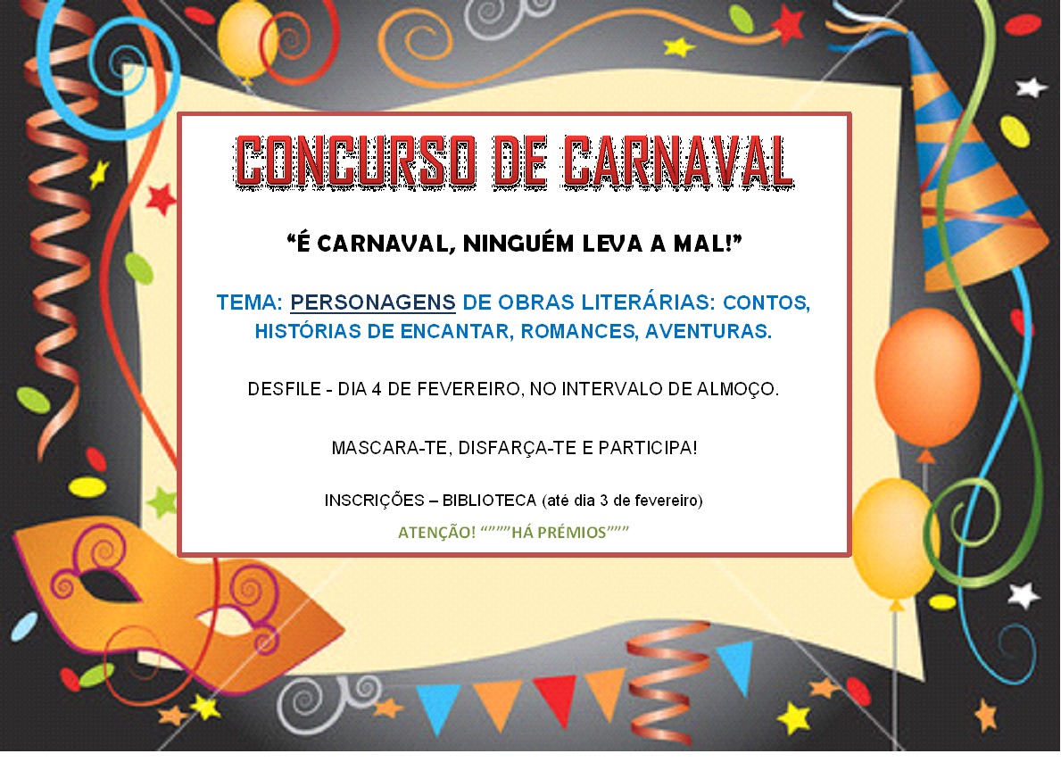 Tendo como ponto de partida obras literárias e personagens dessas mesmas obras (romances, contos, aventuras e histórias de encantar), os alunos estão convidados a participar num desfile de Carnaval que decorrerá no átrio na Escola da Sé (dia 4 de fevereiro, durante a hora de almoço).
