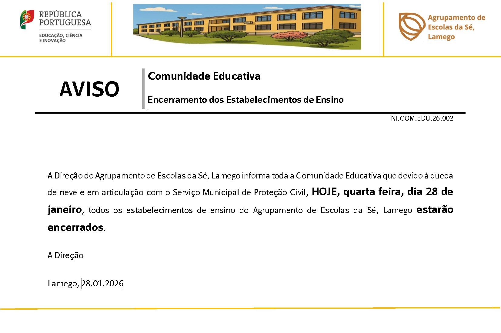 Aviso à Comunidade Educativa - Encerramento dos Estabelecimentos de Ensino no dia 23/01/2026