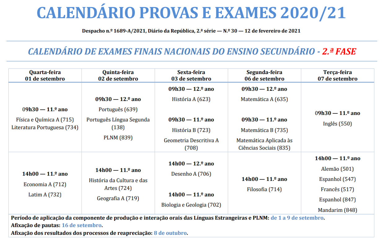 Calendário de Exames Finais do Ensino Secundário 2021 - 2.ª Fase
